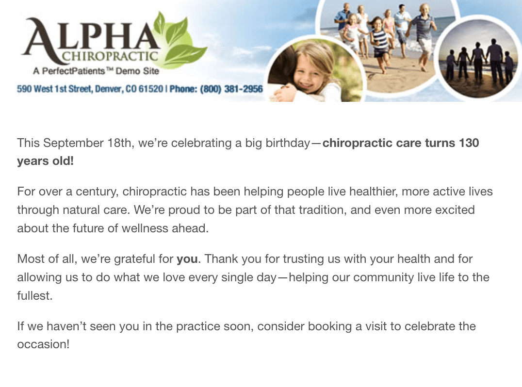 This year, we’ve created one special email template to help you celebrate chiropractic’s 130th birthday with your patients.