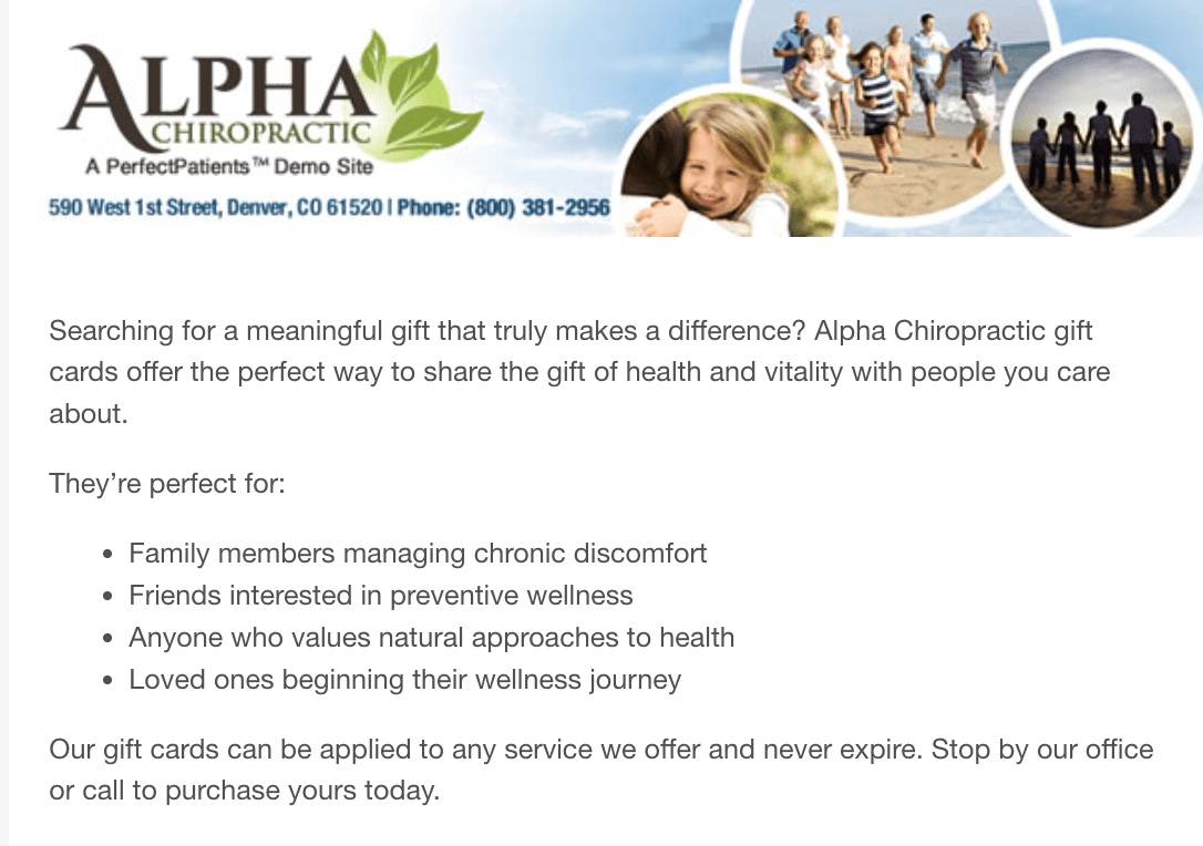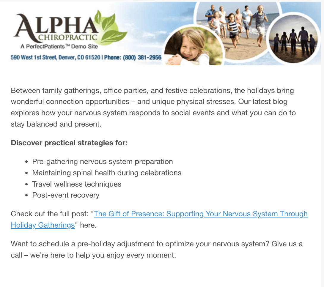 Ready to spread holiday cheer to your patients? Your seasonal email templates are already prepared and waiting for you in your dashboard! Each message is designed to help you share gratitude, inspire wellness, and stay connected during this special time of year. Add your personal touches—and remember, nothing sends until you approve it. Take your time crafting the perfect message before hitting “Send.”