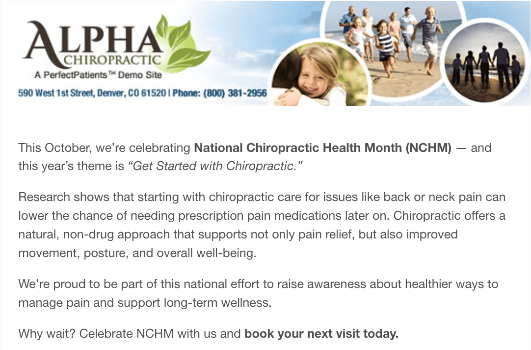 We’ve got you covered with a National Chiropractic Health Month email! A ready-to-use template is available in your dashboard to help you get started. Don’t worry—it won’t be sent without your approval. Feel free to customize the content to match your voice before hitting send!