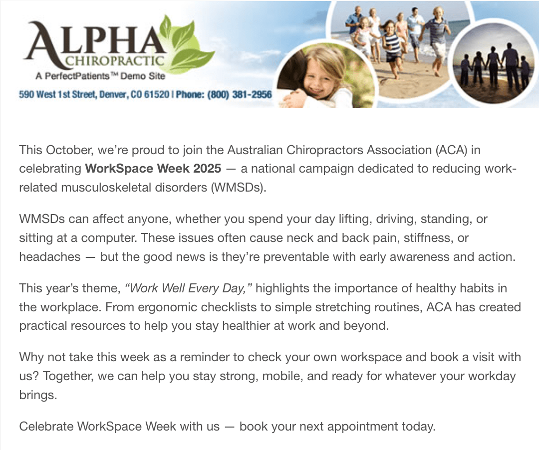 Get ready to inspire your patients to create healthier work habits with this year’s WorkSpace Week! The 2025 theme, “Work Well Every Day,” encourages balance, movement, and better posture to support wellbeing at work and beyond. This is a great opportunity to keep your practice front-of-mind and highlight your role in promoting healthier work environments.